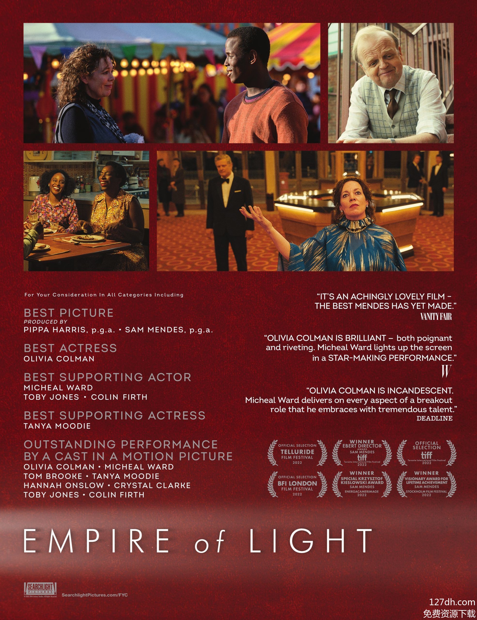 这部电影的故事发生在1980年代英国的海滨小镇,主角是老式电影院“帝国”的经理希拉里。她平时总是一副波澜不惊的样子,每天重复着检查影厅、安排场次、和同事搭话的日常,但其实心里藏着不少过去的伤口,连笑起来都带着点勉强。后来影院来了个刚毕业的黑人青年斯蒂芬,他对电影满是热情,干活也勤快,身上的活力像阳光一样晃眼。一开始两人只是普通同事,希拉里会提醒他注意影院的规矩,斯蒂芬偶尔会和她聊起喜欢的电影片段。慢慢相处下来,他们发现彼此都懂对方的孤独——希拉里要应付老板的无理要求,还要藏起自己的脆弱;斯蒂芬则因为肤色在那个年代总被异样眼光盯着,连走在路上都得小心翼翼。两人开始一起在空荡的影厅里看老电影,分享各自的小秘密,就像在灰蒙蒙的日子里找到了一束暖光。不过现实的麻烦也跟着来:同事的议论、外界的偏见,还有希拉里旧病复发的困扰,都让这段关系变得摇摇欲坠。整个片子的镜头特别怀旧,老影院的红色丝绒座椅、卷动的胶片、昏暗走廊里的灯光,都像把人拉回了那个慢节奏的胶片时代。里面没有啥激烈的冲突,就是靠一些细节打动人——比如希拉里偷偷给斯蒂芬留的热咖啡,两人在影院屋顶看海的画面,还有斯蒂芬帮希拉里整理头发的瞬间。到最后,希拉里虽然还是要面对生活的难题,但因为和斯蒂芬的相遇,她好像终于敢直面自己的内心,重新捡起对生活的期待了。